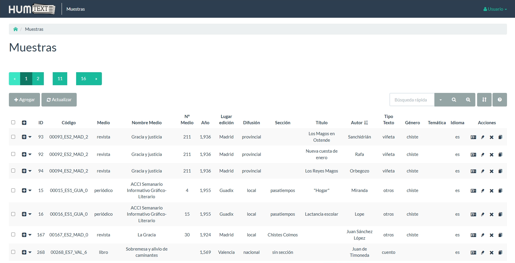 - a) Private section. This is intended for internal corpus management. It allows administrators to manage all the information associated with each entry, including the scanned image, the name of the publication, the date, the transcription, and other relevant metadata.